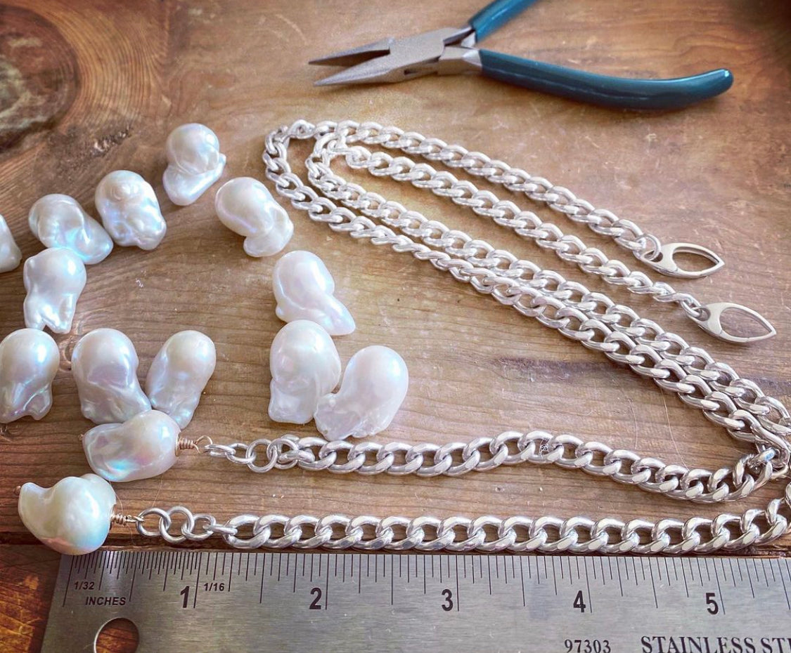 I started experimenting with making jewelry after my son was born- over twenty-five years ago. I made mother’s bracelets with sterling silver and gold beads, and I sold them to a local maternity store. After becoming a single mother, I moved to Sun Valley, Idaho and made pearl eyeglass holders. I began selling my jewelry to the Sun Valley Lodge, local art galleries, and clothing stores. Sometimes I would sell my necklaces right off my neck!